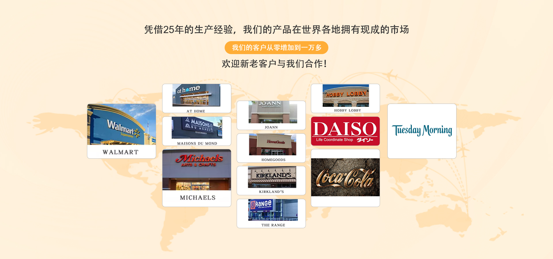 根据25年的OEM/ODM订单生产经验,流行的设计,有竞争力的价格和高质量,我们为Target,Wal-Mart,Hobby Lobby,Macallan,PYRAT RUM, dtobterra等生产产品。目前,中艺占地面积2万多平方米,现有员工200多人。